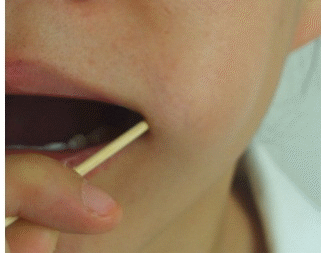 1、手持棉簽,伸進口腔,從口腔內(nèi)側(cè)頰粘膜處(腮幫子內(nèi)側(cè))反復(fù)擦拭20次以上(不時旋轉(zhuǎn)棉棒),取出棉簽,放在干凈白紙上陰干。